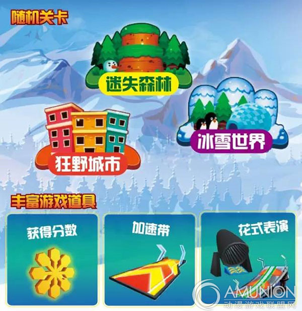 2、游戏内容丰富、有趣味:游戏除了可以联网竞技,还可以选择双板或者单板来进行游戏,同时游戏过程中玩家可以吃道具获得相应的分数,还有花式表演获分数的设置,最后到达终点后发布成绩并颁奖;整个游戏内容的设置十分丰富;