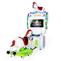 冠军骑士游艺机是世宇科技最新自主研发的一款模拟竞速类休闲游艺机?台。以赛马为游戏主题,玩家骑在仿真的马体上,左右摆动缰绳控制游戏画面马的赛跑方向,向上拉动缰绳,使游戏画面的马跳起跨过障碍物,支持2-8匹马连线竞速;动感的马体,让玩家体验真实的赛马竞速快感。