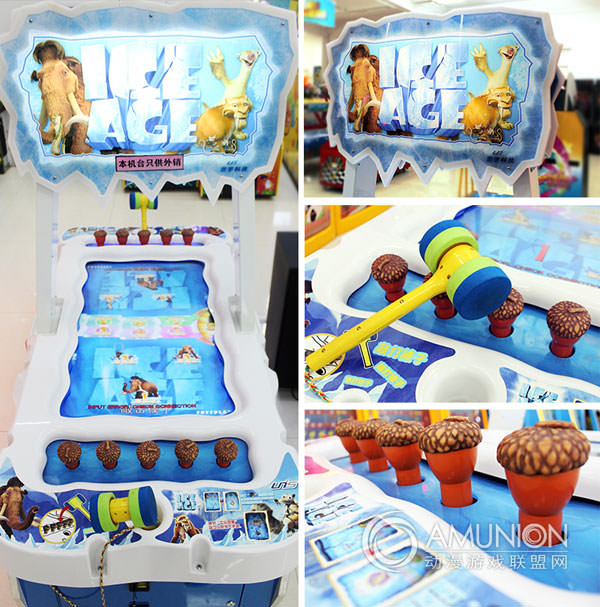冰河世纪游艺机玩法:投入代币后,敲击榛子,破冰后击中游戏中的动物获得相应的奖励。