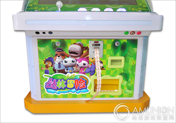 丛林冒险彩票游戏机为3台连线,每台8门押注,每局可设25-30秒不等的押注时间,在押注时间内,玩家可押熊猫、蓝豹、红猴、兔子中的一种或多种进行押注,每种动物拥有不同的倍率,熊猫倍率最高,兔子倍率最低。押注时间到了之后,将弹出中奖动物的画面。如果玩家在8门押注里押中后即可得分,分数为押注分数乘以倍率。当玩家选择停止玩乐,可按出票键根据所得分数获取相应的彩票数。