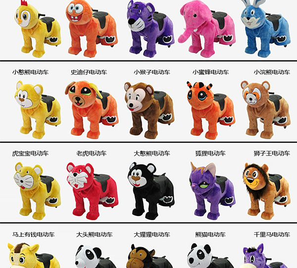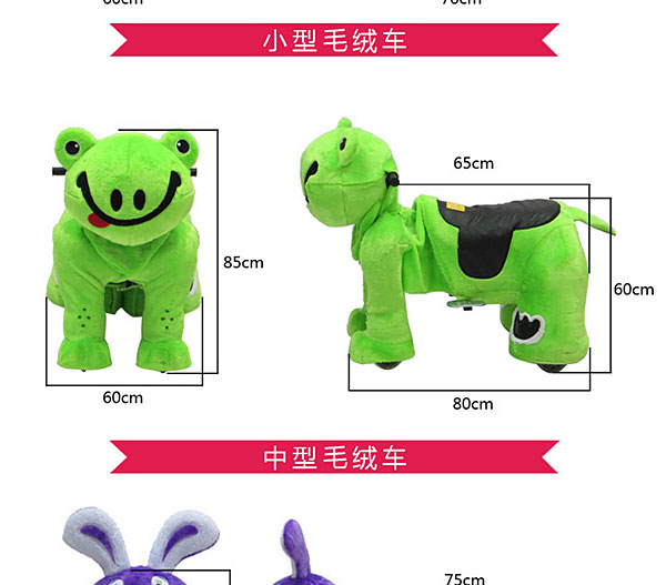 儿童毛绒玩具电动车是集儿童玩具、毛绒玩具、童车、娱乐车、电动车于一体的电动玩具。机台外观造型可爱,外表采用高档PV绒面料,颜色鲜艳丰富,手感细腻,方便保养,可清洗,且不易褪色掉毛。配有MP3立体声播放器,支持任意下载。机台易管理操作,机身光效亮丽,产品体积小,重量轻,趣味性强,款式多样。游戏启动方式有:遥控,手动和投币三种,适合4岁以上的儿童玩乐,大人也可以陪同骑乘。