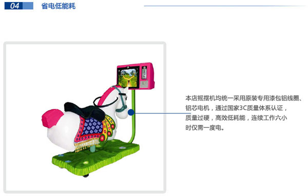 3D赛马豪华型摇摆机一种由玻璃钢和橡胶做成的外壳,经电机驱动制成一种可以上下摇动的儿童玩具车。在机台接通电源后,当投入所需币量时,微电脑自动识别真假硬币并响应系统,启动电源工作并统计投币次数,机器开始前后上下摇摆。同时播放清脆响亮的儿歌、卡通音乐以及游戏提示音等,让儿童体验视觉和听觉上的双重享受,感受全方位的快乐。